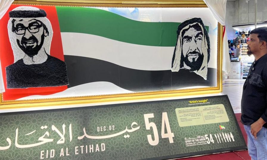 അനിൽ കുമ്പനാട് ഒരുക്കിയ ഈ കലാവിരുന്ന് നിലവിൽ മദീനാ സായിദ് ഷോപ്പിങ് സെന്ററിൽ പ്രദർശനത്തിന് വെച്ചിരിക്കുകയാണ്. ഈ അപൂർവ ചിത്രം കാണാനും ഫോട്ടോ എടുക്കാനുമായി ദിവസവും നൂറുകണക്കിന് ആളുകളാണ് ഷോപ്പിങ് സെന്ററിലേക്ക് എത്തുന്നത്. യുഎഇയുടെ ദേശീയ ദിനാഘോഷങ്ങളുടെ ഭാഗമായി ഒരുക്കിയ ഈ പ്രദർശനം ഡിസംബർ 10 വരെ നീണ്ടുനിൽക്കും.