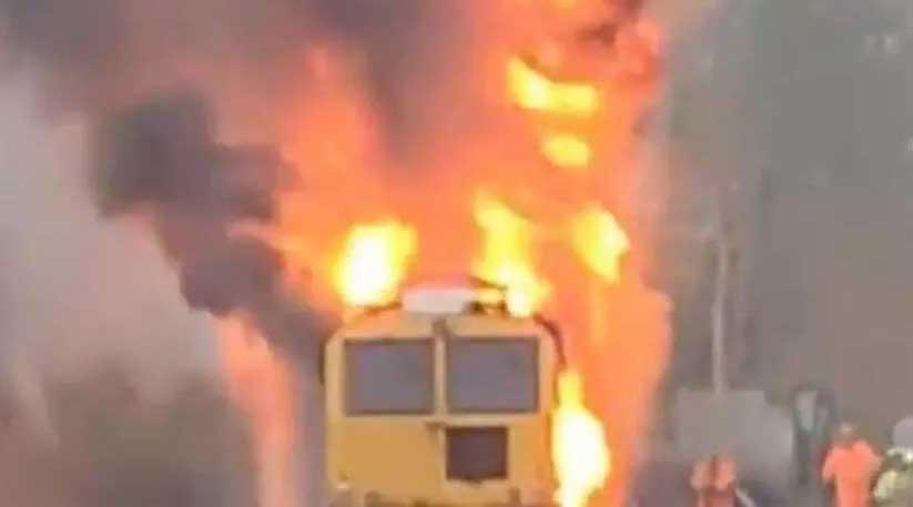എഞ്ചിന് ഭാഗത്തുണ്ടായ തീ മറ്റിടങ്ങളിലേക്ക് പകരാത്തതിനാല് ദുരന്തം ഒഴിവായി.യാത്രക്കാരെല്ലാവരും സുരക്ഷിതരാണെന്ന് റെയില്വെ അധികൃതര് അറിയിച്ചു. തീയണക്കാനുള്ള ശ്രമം തുടരുകയാണ്.. തീപ്പിടുത്തത്തിനുള്ള കാരണം വ്യക്തമല്ല.