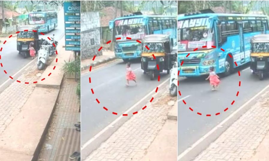 ഇതിനിടയിലാണ് സ്വകാര്യ ബസ് വന്നത്. കുഞ്ഞിനെ കണ്ടതും ബസ് ഡ്രൈവര് ബസ് വലതുവശത്തേക്ക് അല്പ്പം മാറ്റി സഡന് ബ്രേക്കിട്ട് നിര്ത്തി. ബസിന്റെ പിന്ചക്രമുള്ള ഭാഗം കുഞ്ഞിനെ തൊട്ടുതൊട്ടില്ല എന്ന നിലയിലായിരുന്നു. ബസ് കണ്ടതും കുഞ്ഞ് ഉടനെ തിരിച്ച് ഓട്ടോ നിന്നിരുന്ന ഭാഗത്തേക്ക് ഓടിപ്പോവുകയായിരുന്നു.