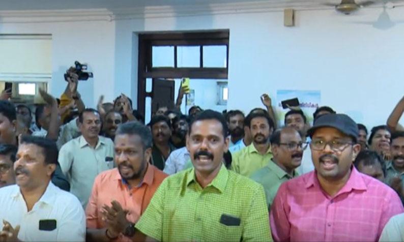 കൗണ്സിലര്മാരുടെ സത്യപ്രതിജ്ഞ; തിരുവനന്തപുരം കോര്പ്പറേഷനില് ഗണഗീതം പാടി ബിജെപിക്കാര്, പ്രതിഷേധം
