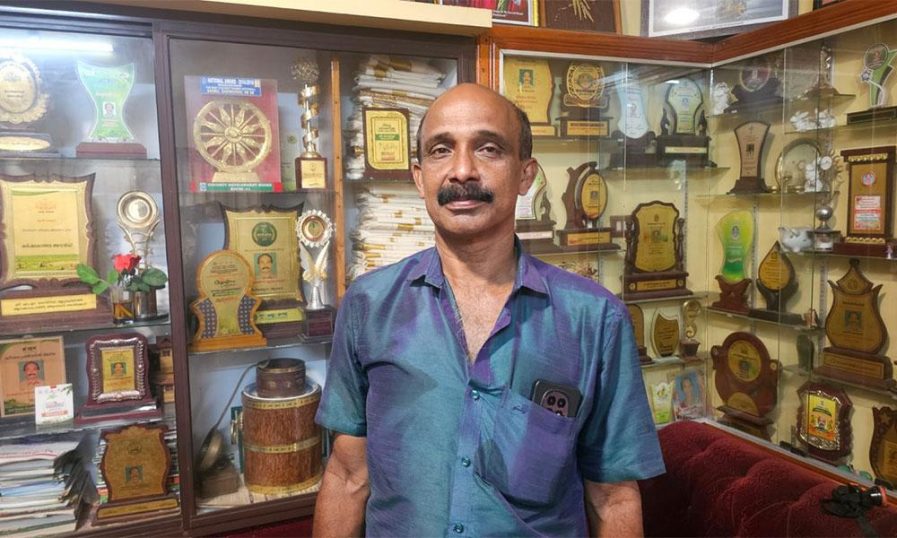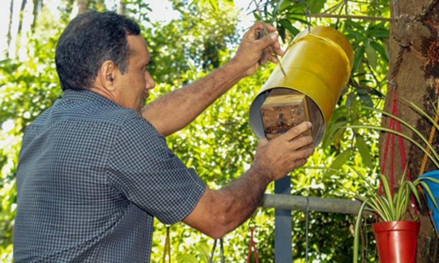 സാബു തറക്കുന്നേൽ തേനീച്ചകൃഷിക്കിടെ