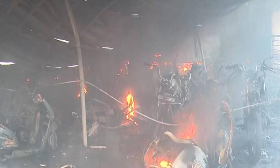 വൈദ്യുതി ലൈനില് നിന്ന് തീപ്പൊരി വീണാണ് അപകടമുണ്ടായതെന്നാണ് പോലീസിന്റെ നിഗമനം. പാര്ക്കിങ് ഏരിയയുടെ മേല്ക്കൂരയിലെ വിടവിലൂടെ വൈദ്യുതി ലൈനില് നിന്ന് തീപ്പൊഴി വീഴുകയും അത് ഒരു ബൈക്കിന്റെ പെട്രോള് ടാങ്കില് വീഴുകയും ആ ബൈക്കില് നിന്ന് മറ്റ് ബൈക്കുകളിലേക്ക് തീ പടരുകയുമായിരുന്നു എന്നാണ് പോലീസിന്റെ പ്രാഥമിക നിഗമനം. ജീവനക്കാരുടെ മൊഴിയുള്പ്പെടെ എടുത്ത ശേഷമാണ് പോലീസ് ഈ നിഗമനത്തിലെത്തിയത്.