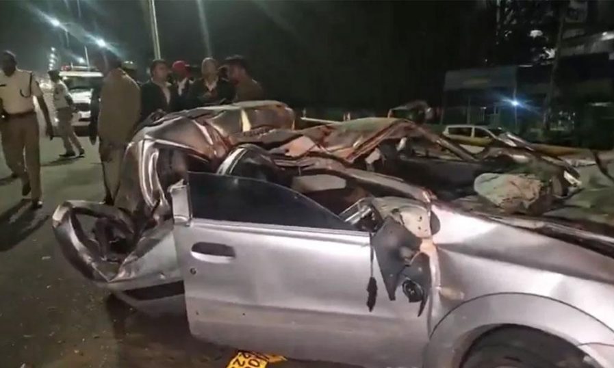 തുമകൂരുവില് നിന്ന് അമിതവേഗതയിലെത്തിയ ഇന്ഡിക്ക കാര് നിയന്ത്രണം നഷ്ടപ്പെട്ട് ഡിവൈഡര് ഇടിച്ചിട്ട് ബസിലിടിക്കുകയായിരുന്നു. നാലുപേര് സംഭവസ്ഥലത്തുവച്ചുതന്നെ മരിച്ചു. അവധിദിവസം ആഘോഷിക്കാന് പോയതായിരുന്നു വിദ്യാര്ത്ഥികള്. അപകടത്തില് കാര് പൂര്ണമായും തകര്ന്നു. ഗുരുതര പരുക്കേറ്റ കാര് ഡ്രൈവറെ പ്രാദേശിക ആശുപത്രിയില് എത്തിച്ചെങ്കിലും ജീവന് രക്ഷിക്കാനായില്ലെന്ന് പോലീസ് അറിയിച്ചു.