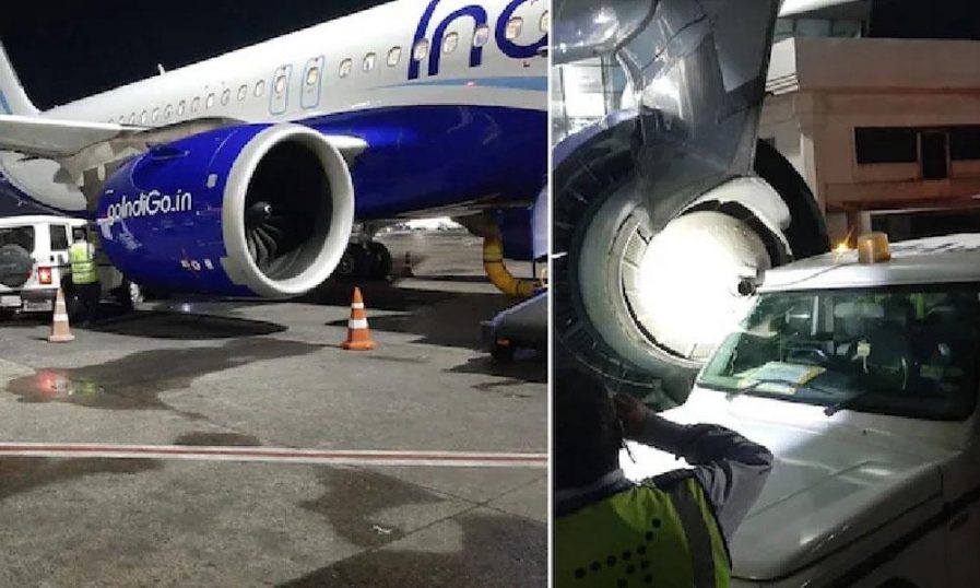 പരിശോധനയ്ക്കായി നിലത്തിറക്കിയ ഇന്ഡിഗോ വിമാനം; നിയന്ത്രണം വിട്ട കാറ്ററിങ് വാഹനം ഇടിച്ചു