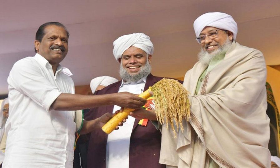 കേരളയാത്രക്ക് കൽപ്പറ്റയിലെ പാങ്ങിൽ അഹ്മദ് കുട്ടി മുസ്ലിയാർ നഗരിയിൽ നടന്ന സ്വീകരണ സമ്മേളനത്തിനിടെ മന്ത്രി ഒ ആർ കേളു യാത്രാ ഉപനായകരായ സയ്യിദ് ഇബ്റാഹീം ഖലീൽ അൽ ബുഖാരിക്കും പേരോട് അബ്ദുർറഹ്മാൻ സഖാഫിക്കും നെൽക്കതിർ സമ്മാനിക്കുന്നു