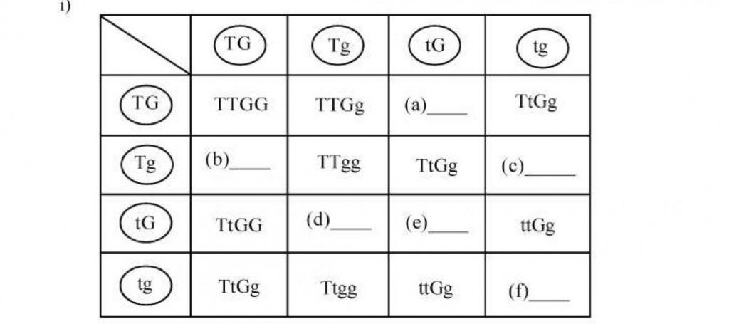 18. A) ഉയരം കൂടിയതും പച്ചനിറമുള്ള വിത്തുകളുള്ളതുമായ (TtGg) പയറുചെടിയെ ഉയരം കുറഞ്ഞതും മഞ്ഞനിറമുള്ളതുമായി (ttgg) പയറുചെടിയുമായി വർഗസങ്കരണം നടത്തിയപ്പോൾ കിട്ടിയ ഓന്നാം തലമുറ ഉയരം കൂടിയതും പച്ചനിറമുള്ളതുമായ (TiGg) പയർ ചെടിയാണ്. ഇതിനെ സ്വപരാഗണത്തിന് വിധേയമാക്കിയാൽ കിട്ടുന്ന രണ്ടാം തലമുറ പൂർത്തീകരിക്കുക. (4)