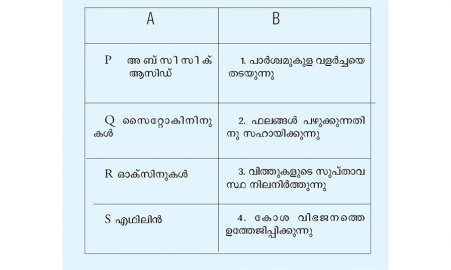 2 A കോളത്തിനനുസരിച്ച് B കോളം ക്രമീകരിച്ചതിൽ ശരിയായത് കണ്ടെത്തി എഴുതുക. (1)