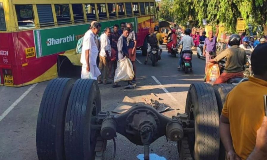 രണ്ട് വാഹനങ്ങളില് ഇടിച്ച കെഎസ്ആര്ടിസി ബസിന്റെ പിന് ചക്രങ്ങള് ഊരിത്തെറിച്ചു; അപകടം മണ്ണൂത്തിയില്