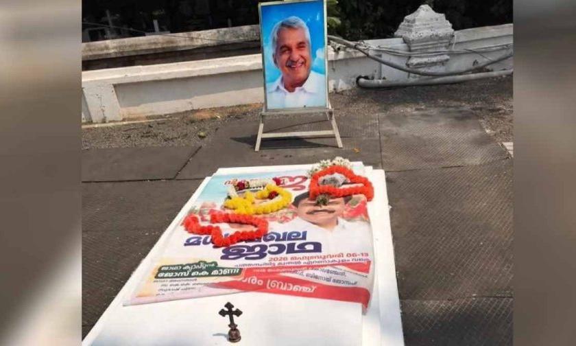ഉമ്മന്ചാണ്ടിയുടെ കല്ലറക്ക് മുകളില് എല്ഡിഎഫ് ജാഥയുടെ പോസ്റ്റര്; വിവാദം പുകയുന്നു