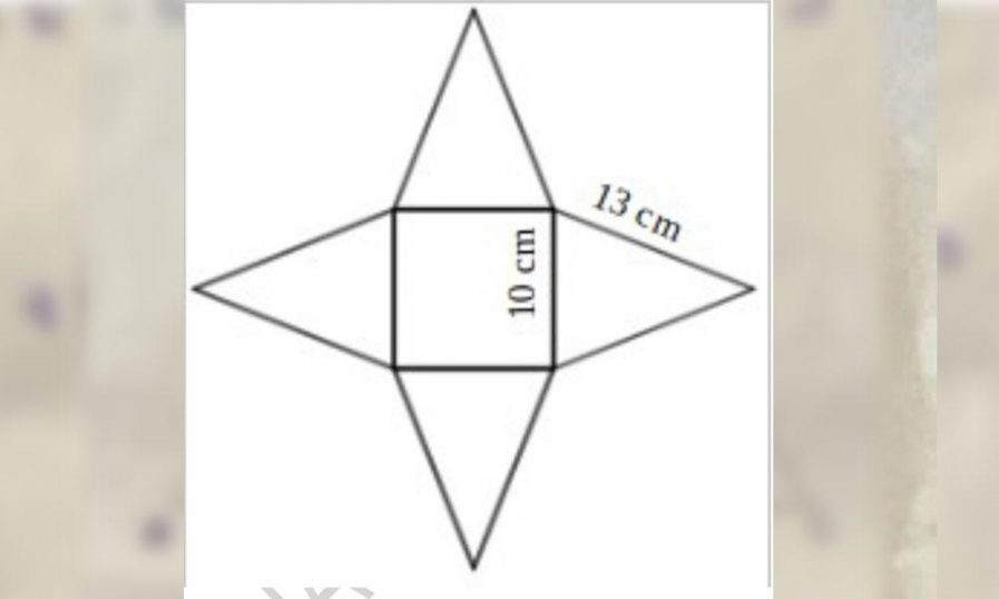 B). ഒരു സമചതുര സ്തൂപിക താഴെ കാണുന്ന രീതിയിൽ ഒരു കാർഡ്ബോർഡ് ഉപയോഗിച്ച് നിർമ്മിച്ചിരിക്കുന്നു. ചതുരത്തിന്റെ ഓരോ വശവും 10 സെ.മീ ആണ്. ത്രികോണങ്ങളുടെ തുല്യവശങ്ങളുടെ നീളം 13 സെ.മീ ആണ്.