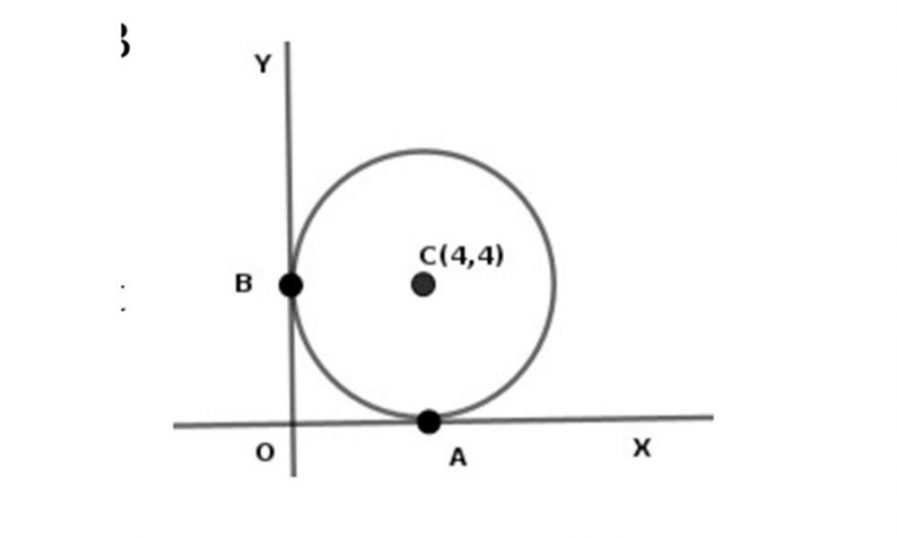 ഒരു വൃത്തത്തിന്റെ കേന്ദ്രം C(4, 4) ആണ്. ആ വൃത്തത്തിന്റെ X അക്ഷവും Y അക്ഷവും യഥാക്രമം A, B ബിന്ദുക്കളിൽ കൂടി തൊടുന്നു.