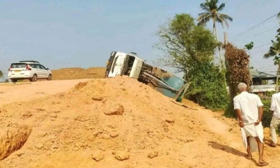 ദേശീയപാത നിര്മാണം നടക്കുന്നയിടത്ത് എത്തിച്ച ലോറിയാണ് തലകീഴായി മറിഞ്ഞത്.