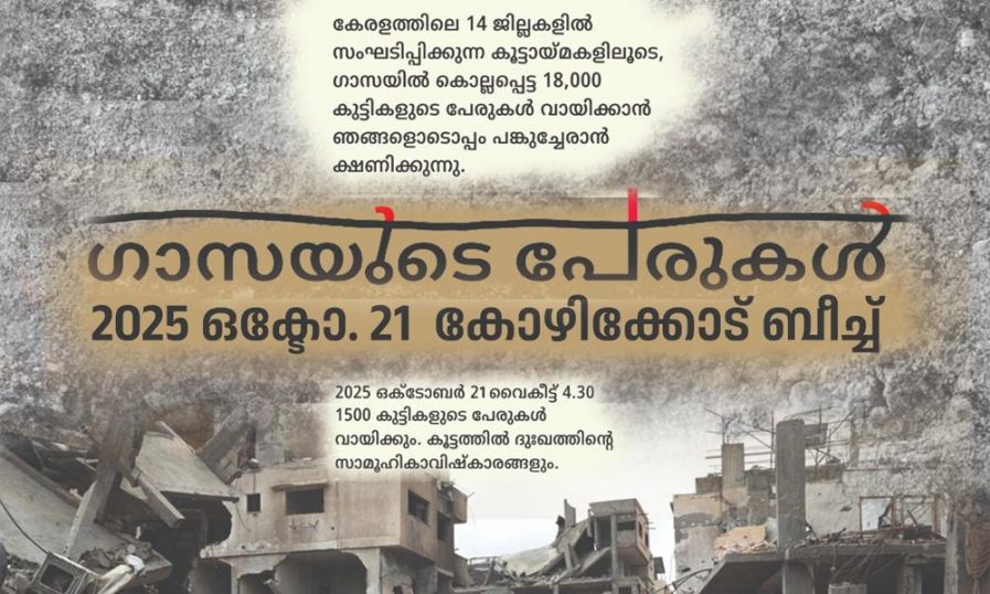 ഒക്ടോബര് 21 ന് കോഴിക്കോട് ബീച്ചില് ഗസയില് കൊലചെയ്യപ്പെട്ട കുട്ടികളുടെ പേരുകള് വായിക്കും. ബഹുജന റാലിയും വിവിധ പരിപാടികളും ഇതോടൊപ്പമുണ്ടാവും. ഐക്യദാര്ഢ്യ പരിപാടിയുടെ ഭാഗമായി കോഴിക്കോട്ടെ കലാകാരന്മാര് ഇന്ന് വൈകുന്നേരം അഞ്ചു മണിക്ക് ക്രൗണ് തിയറ്ററിന്റെ വലതു വശത്തെ മതിലില് ഫ്രീ ഫലസ്തീന് ഗസാമതില് നിര്മ്മിക്കും.