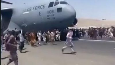 പറയുന്നയരാന് ഒരുങ്ങുന്ന യു എസ് സൈനിക വിമാനത്തിനൊപ്പം നൂറുകണക്കിന് പേര് ഓടുന്ന വീഡിയോ സാമൂഹിക മാധ്യമങ്ങളില് പ്രചരിക്കുന്നുണ്ട്. വിമാനത്താളത്തില് ഇറങ്ങിയ വിമാനത്തിലേക്ക് ചാടിക്കയറാന് ശ്രമിക്കുന്നതും ടയറില് അള്ളിപ്പിടിക്കുന്നതുമെല്ലാം വീഡിയോയിലുണ്ട്. അതേസമയം, അഫ്ഗാനിസ്ഥാനിലെ ആഗോള ഭീകരവാദ ഭീഷണിയെ അടിച്ചമര്ത്താന് ലോകം ഒന്നിക്കണമെന്ന് ഐക്യരാഷ്ട്ര സഭ മേധാവി അന്റോണിയോ ഗുട്ടറസ് ആഹ്വാനം ചെയ്തു.