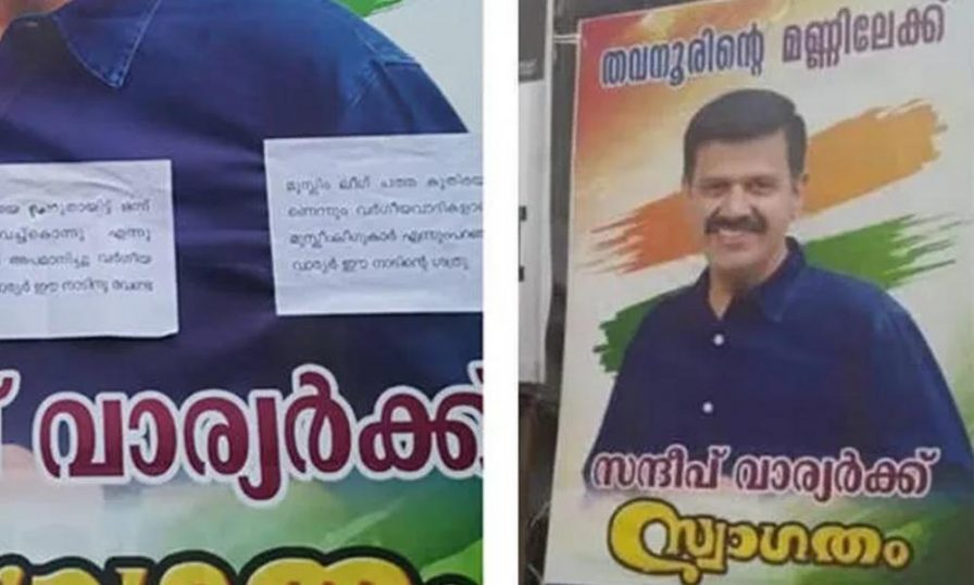 മുസ്ലിം സമുദായത്തെ കഴുത്തില് ടയര് ഇട്ട് കത്തിക്കണം എന്ന് പറഞ്ഞ മതപ്രാന്തന് സന്ദീപ് വാര്യരെ തവനൂരിലേക്ക് വേണ്ട, മുസ്ലിം ലീഗ് ചത്ത കുതിരയാണെന്നും വര്ഗീയവാദികളാണ് മുസ്ലിം ലീഗുകാരെന്നും പറഞ്ഞ വാര്യര് ഈ നാടിന്റെ ശത്രു’ എന്നെല്ലാമാണ് സ്വാഗതം ചെയ്തു സ്ഥാപിച്ച ഫ്ലക്സിനു മുകളില് പതിച്ച പോസ്റ്ററിലുള്ളത്.