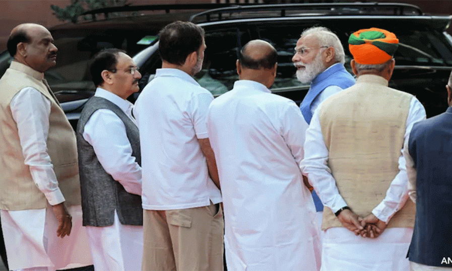 പാർലിമെന്റിന്റെ മുറ്റത്ത് കുശലം പറഞ്ഞ് മോദിയും രാഹുൽ ഗാന്ധിയും; വൈറലായി ഇന്ത്യൻ രാഷ്ട്രീയത്തിലെ ആ അപൂർവ്വ കാഴ്ച