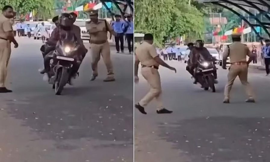 വാഹനങ്ങള്ക്ക് പ്രവേശനമില്ലാത്ത റോഡിലൂടെ ഒരു ബൈക്കില് മൂന്നുപേരാണ് നിയന്ത്രണം മറികടന്ന് പോയത്. ബൈക്ക് ഓടിച്ചിരുന്ന ആള്ക്ക് മാത്രമാണ് ഹെല്മറ്റ് ഉണ്ടായിരുന്നത്. സംഭവത്തില് പോലീസ് അന്വേഷണം ആരംഭിച്ചു. ബൈക്ക് നിരീക്ഷണത്തിലാണെന്നും ഉടന് യുവാക്കളെ കസ്റ്റിഡിയിലെടുക്കുമെന്നും പാലാ സിഐ പറഞ്ഞു.