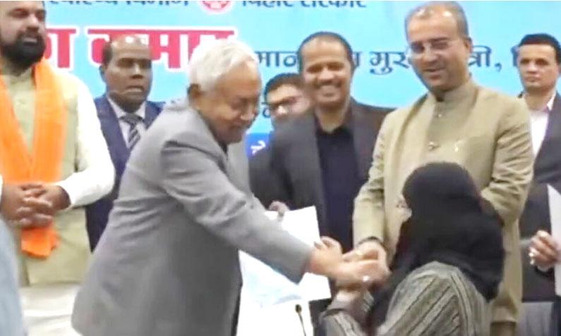 സര്ക്കാര് സംഘടിപ്പിച്ച ചടങ്ങില് ആയുര്വേദ, യോഗ, പ്രകൃതി ചികിത്സ, യുനാനി, സിദ്ധ, ഹോമിയോപ്പതി ഡോക്ടർമാർക്ക് നിയമനക്കത്ത് നൽകുകയായിരുന്നു മുഖ്യമന്ത്രി. നിഖാബ് ധരിച്ച യുവതി നിയമനക്കത്ത് സ്വീകരിക്കാനെത്തിയപ്പോൾ മുഖ്യമന്ത്രി മുഖം ചുളിച്ച് “ഇത് എന്താണ്?’ എന്ന് ചോദിക്കുകയായിരുന്നു. തുടർന്ന് യുവതിയുടെ നിഖാബ് താഴേക്ക് വലിക്കുകയായിരുന്നു. പരിഭ്രാന്തയായ യുവതിയെ ഒരു ഉദ്യോഗസ്ഥൻ ഉടൻ മാറ്റിനിർത്തുന്നതും ഉപമുഖ്യമന്ത്രി സാമ്രാട്ട് ചൗധരി മുഖ്യമന്ത്രിയെ നിയന്ത്രിക്കാൻ ശ്രമിക്കുന്നതും വീഡിയോയിൽ കാണാം.