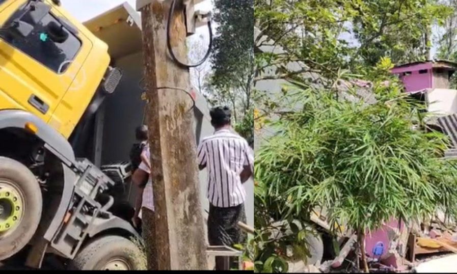 നെടുങ്കണ്ടത്ത് ടോറസ് ലോറി വീടിന് മുകളിലേക്ക് മറിഞ്ഞ് അപകടം