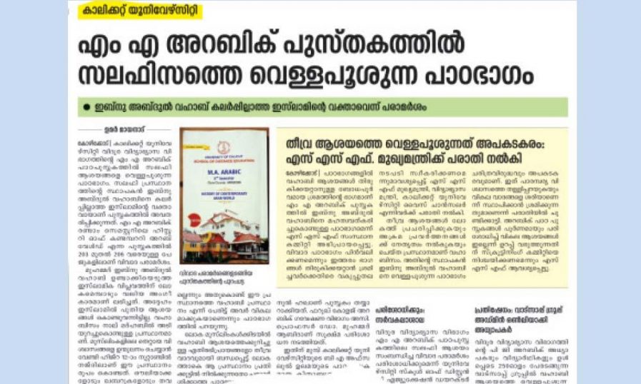 കോഴിക്കോട് | വിദൂര വിദ്യാഭ്യാസ വിഭാഗം എം എ അറബിക് പാഠപുസ്തകത്തിലെ സലഫി ആശയങ്ങളെ വെള്ളപൂശുന്ന പാഠഭാഗം പിൻവലിക്കാൻ കാലിക്കറ്റ് യൂനിവേഴ്സിറ്റിക്ക് മടി. വിവാദത്തിനിട വരുത്തിയ പാഠഭാഗത്തെക്കുറിച്ച് അന്വേഷണം നടത്തി ഉടൻ നടപടി സ്വീകരിക്കണമെന്ന് മുഖ്യമന്ത്രിയുടെയും ഉന്നത വിദ്യാഭ്യാസ വകുപ്പിന്റെയും ഓഫീസുകൾ യൂനിവേഴ്സിറ്റിയോട് ആവശ്യപ്പെട്ടിരുന്നുവെങ്കിലും അധികൃതർ ഉരുണ്ടുകളി തുടരുകയാണ്.