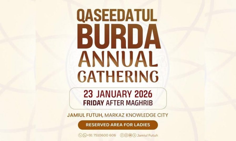 കോഴിക്കോട് | മര്കസ് നോളജ് സിറ്റിയിലെ ജാമിഉല് ഫുതൂഹിലെ ആത്മീയ ചൈതന്യവും പ്രവാചകാനുരാഗവും നിറഞ്ഞ ഖസീദതുല് ബുര്ദ മജ്ലിസിന്റെ മൂന്നാം വാര്ഷിക സംഗമം വെള്ളിയാഴ്ച (ജനുവരി, 23) നടക്കും. മഗ്രിബ് നിസ്കാരാനന്തരം ആരംഭിക്കുന്ന വാര്ഷിക സംഗമത്തില് ലോകപ്രശസ്ത പണ്ഡിതന്മാര് അതിഥികളാകും.