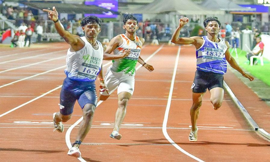 വേഗരാജാവ് | സംസ്ഥാന സ്കൂൾ കായികമേളയിലെ സീനിയർ വിഭാഗം ആൺകുട്ടികളുടെ നൂറ് മീറ്റർ ഓട്ടത്തിൽ പാലക്കാട് ചിറ്റൂർ ജി എച്ച് എസ് എസിലെ നിവേദ് കൃഷ്ണ (ഇടത്ത് നിന്ന് ആദ്യം) ഒന്നാമതായി ഫിനിഷ് ചെയ്യുന്നു | ഫോട്ടോ: ടി ശിവജികുമാർ