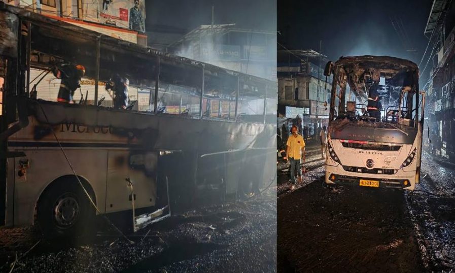 ബസില് നിന്ന് പുക ഉയരുന്നത് കണ്ടതിന് പിന്നാലെ ബസ് നിര്ത്തി യാത്രക്കാരെ പുറത്തിറക്കി പരിശോധിക്കുന്നതിനിടെ വാഹനത്തിന്റെ ടയര് പൊട്ടുകയും തീ പടരുകയുമായിരുന്നു. ബസിനുള്ളിലുണ്ടായിരുന്ന യാത്രക്കാരുടെ വസ്തുവകകളെല്ലാം കത്തിനശിച്ചു. സംഭവസ്ഥലത്ത് ഫയര്ഫോഴ്സ് എത്തി തീയണച്ചെങ്കിലും വാഹനം പൂര്ണമായി കത്തി നശിച്ചിരുന്നു. തീപിടിത്തതിന്റെ കാരണം വ്യക്തമല്ല.
