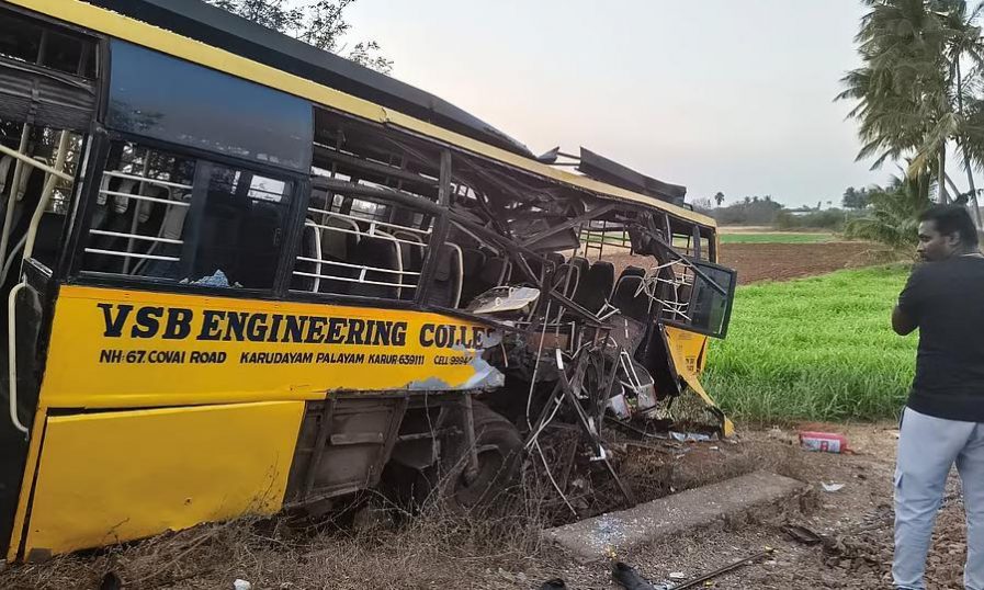 ട്രാക്കിലേക്ക് കയറിയ ബസിലേക്ക് സിമന്റ് പ്ലാന്റിലേക്കുള്ള സാധനങ്ങളുമായി വന്ന ട്രെയിന് ഇടിക്കുകയായിരുന്നു. പരുക്കേറ്റ വിദ്യാര്ഥികളെ കരൂര് സര്ക്കാര് മെഡിക്കല് കോളജ് ആശുപത്രിയില് പ്രവേശിപ്പിച്ചു.