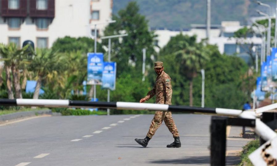 ഇസ്ലാമാബായിൽ രണ്ടാം ഘട്ട സമാധാന ചർച്ചകൾക്ക് ആതിഥേയത്വം വഹിക്കുന്ന, സെറീന ഹോട്ടലിന്റെ സമീപം നടക്കുന്ന പാകിസ്ഥാൻ സൈനികൻ.
