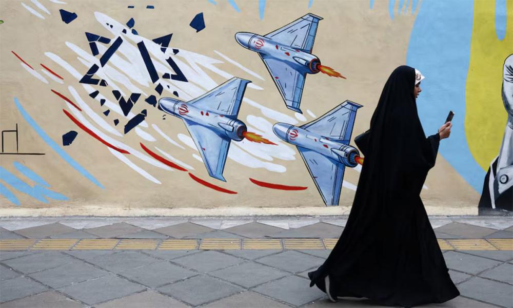ടെഹ്റാനിൽ, യുഎസും ഇറാനും തമ്മിലുള്ള വെടിനിർത്തലിനിടയിൽ, തെരുവിൽ ഇസ്രായേൽ വിരുദ്ധ ചുവർചിത്രത്തിനരികിലൂടെ നടന്നു നീങ്ങുന്ന സ്ത്രീ