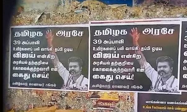 അതിനിടെ വിജയ്ക്കെതിരെ കരൂരില് പോസ്റ്ററുകള് പ്രത്യക്ഷപ്പെട്ടിട്ടുണ്ട്. നിരപരാധികളായ ആളുകളുടെ മരണത്തിന് ഉത്തരവാദിയായ വിജയിനെ അറസ്റ്റ് ചെയ്യണമെന്നും പോസ്റ്ററില് ആവശ്യപ്പെടുന്നു. വിദ്യാര്ഥി കൂട്ടായ്മയുടെ പേരിലാണ് പോസ്റ്റര് പ്രത്യക്ഷപ്പെട്ടത്