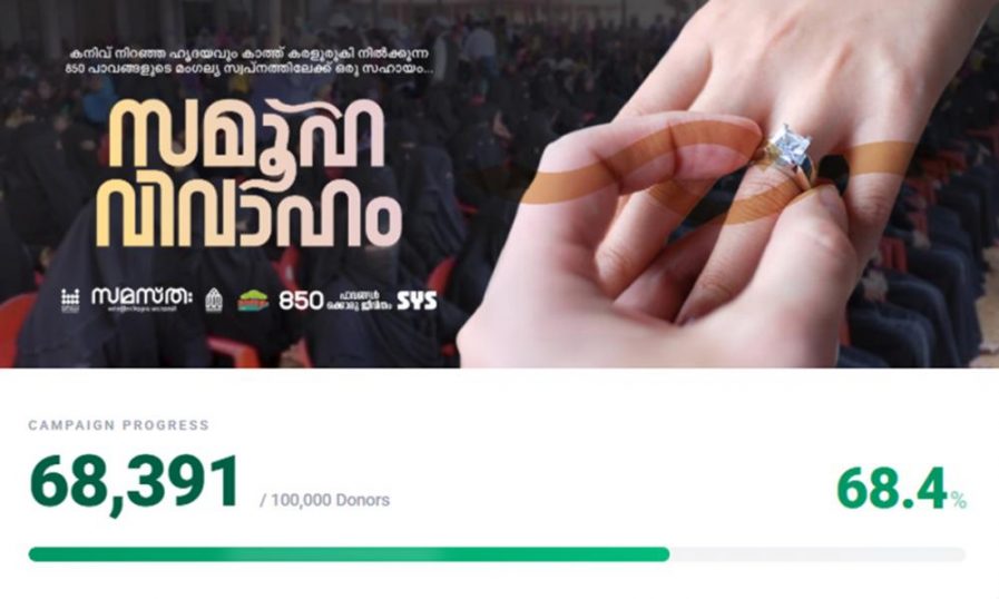 പാടന്തറയിലെ സമൂഹ വിവാഹ പന്തലിൽ നാളെ വിവാഹിതരാകുന്ന 850 പേർക്ക്, ഒരാൾക്ക് ഒരു രൂപ എന്ന കണക്കിൽ 850 രൂപ മാറ്റിവെക്കാം എന്ന ലളിതമായ ആശയമാണ് കേരള മുസ്ലിം ജമാഅത്ത് മുന്നോട്ടുവെച്ചത്. കേരള മുസ്ലിം ജമാഅത്ത് തയ്യാറാക്കിയ ‘സ്വദഖ’ (Swadakha) ആപ്പ് വഴിയായിരുന്നു ധനസമാഹരണം. ഏപ്രിൽ ഒന്നിന് രാത്രി ഒൻപതരക്ക് ആപ്പ് ഓപ്പണായി മിനുട്ടുകൾക്കകം തന്നെ, അണമുറിയാതെ പണമൊഴുകുന്നതാണ് കണ്ടത്. 12 മണിക്കൂറിൽ 50 ലക്ഷം കടന്ന ആവേശം, 24 മണിക്കൂറിൽ ഒരു കോടിയും പിന്നിട്ട് 48 മണിക്കൂർ തികയുമ്പോൾ 3 കോടിയെന്ന അവിശ്വസനീയമായ സംഖ്യയിലെത്തി. ഒടുവിൽ 68 മണിക്കൂർ പിന്നിടുമ്പോൾ 68,000ൽ അധികം മനുഷ്യർ ഈ പുണ്യകർമ്മത്തിൽ കണ്ണികളായിക്കഴിഞ്ഞു. ഒരു ലക്ഷം പേരെ പങ്കെടുപ്പിക്കുക എന്ന ലക്ഷ്യത്തോടെയാണ് ചാലഞ്ച് തുടങ്ങിയത്.