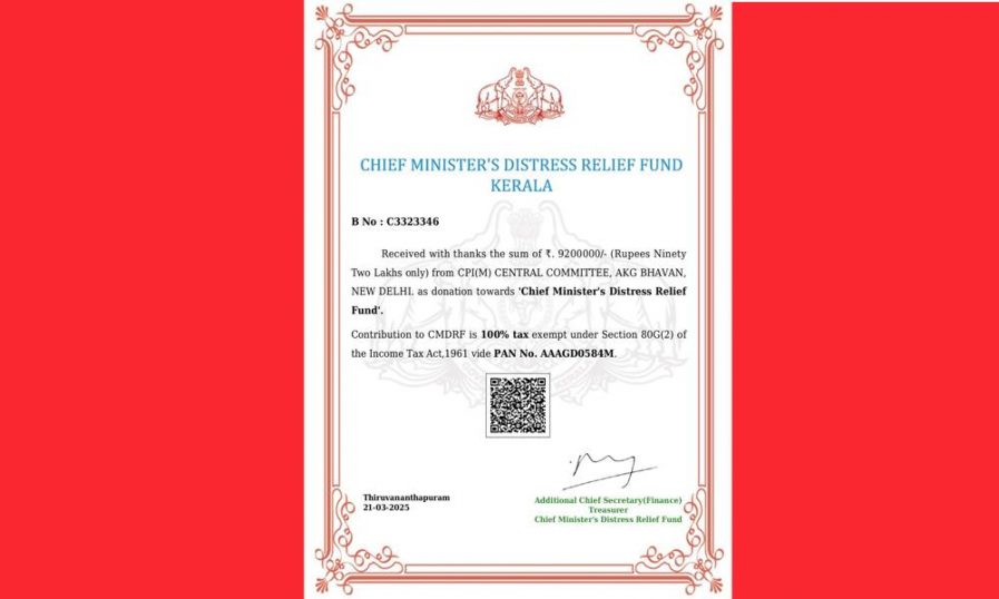 സി എം ഡി ആര് എഫിലേക്ക് പണം കൈമാറിയതിന്റെ റെസീപ്റ്റും പുറത്തുവിട്ടിട്ടുണ്ട്. വയനാട് ഉരുള്പൊട്ടല് ദുരന്തത്തിന്റെ പശ്ചാത്തലത്തില് സി പി എം കേന്ദ്ര കമ്മിറ്റി രൂപീകരിച്ച പ്രത്യേക ഫണ്ടിലേക്ക് ലഭിച്ച തുക പൂര്ണ്ണമായും മുഖ്യമന്ത്രിയുടെ ദുരിതാശ്വാസ നിധിയിലേക്ക് കൈമാറിയിട്ടുണ്ടെന്ന് സി പി എം ജനറല് സെക്രട്ടറി എം എ ബേബി വ്യക്തമാക്കി.