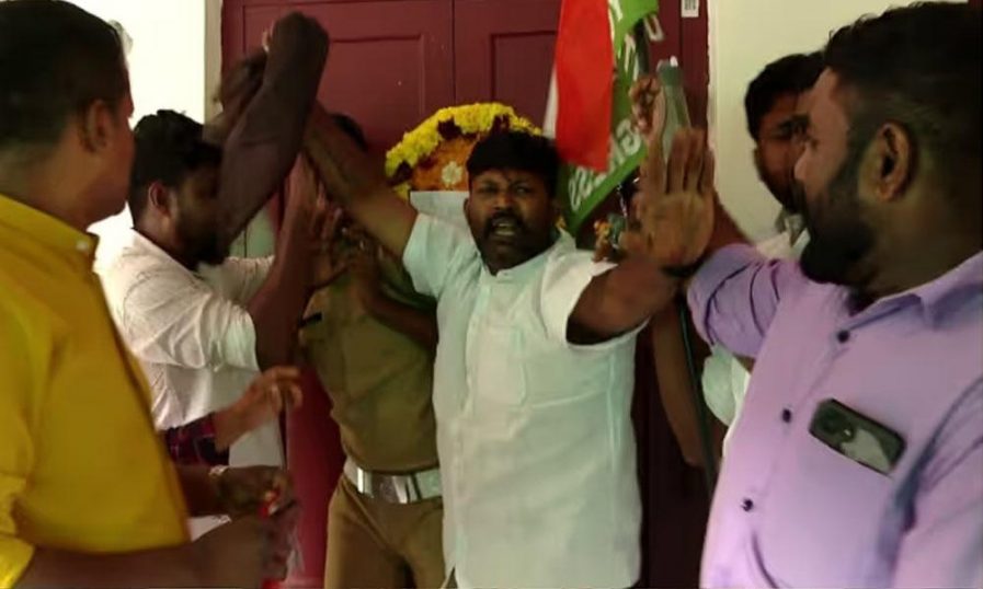 മന്ത്രിയുടെ ഔദ്യോഗിക വസതിക്ക് മുന്നില് സുരക്ഷാ ചുമതലയില് ഉണ്ടായിരുന്ന മൂന്ന് പോലീസുകാരെ പ്രവര്ത്തകര് തള്ളിമാറ്റി